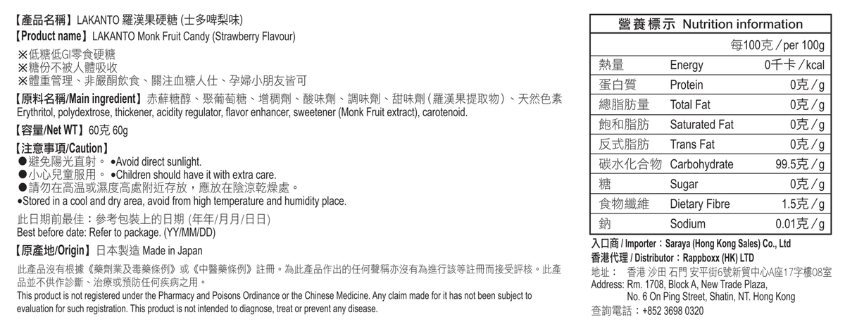 LAKANTO - 零卡路里羅漢果硬糖(士多啤梨味)SARAYA